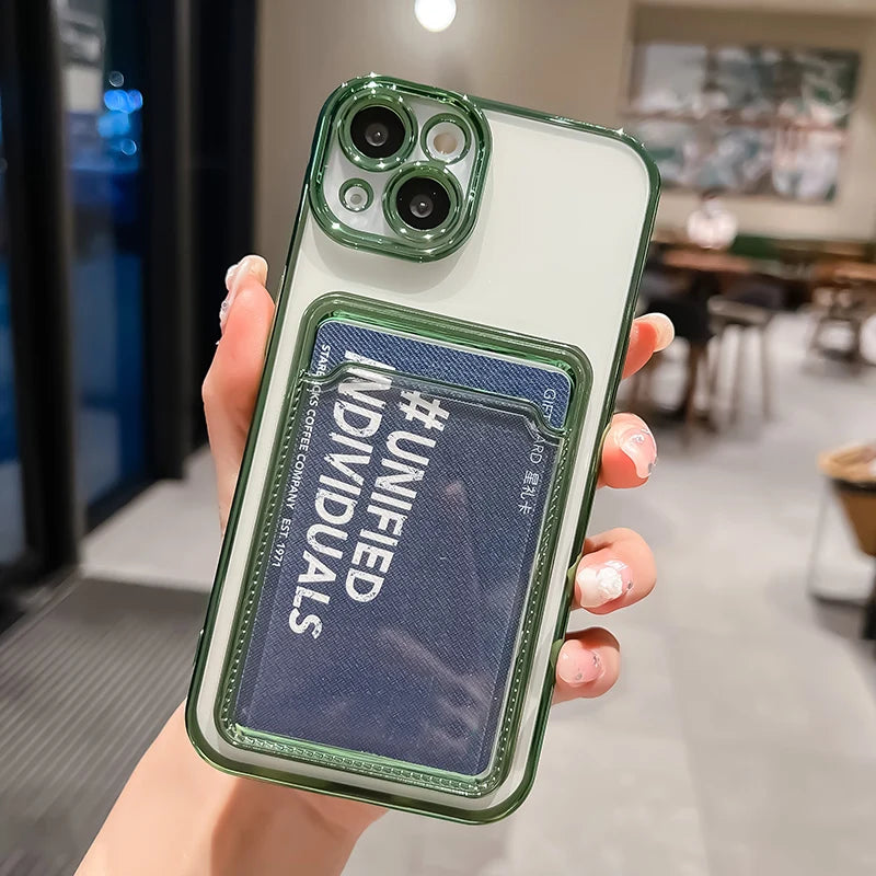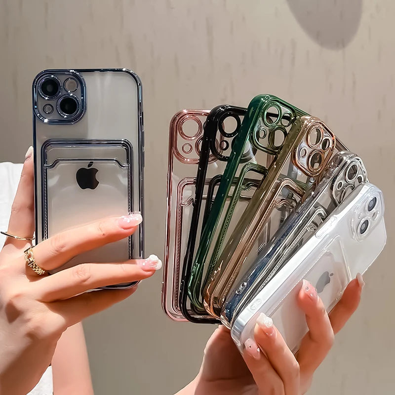 Electroplated Clear Card Holder Wallet Case – Shockproof Transparent Silicone Cover for iPhone